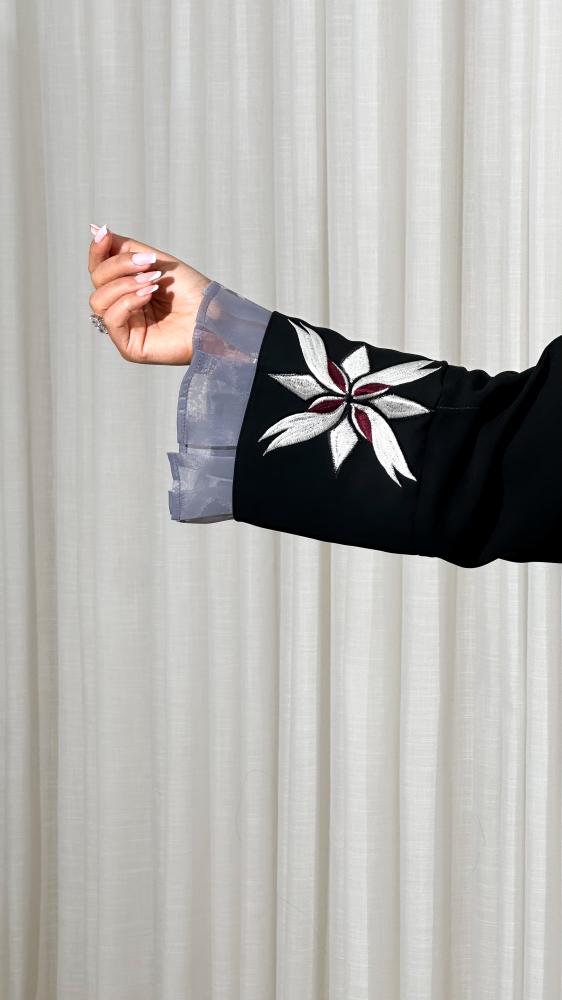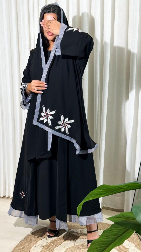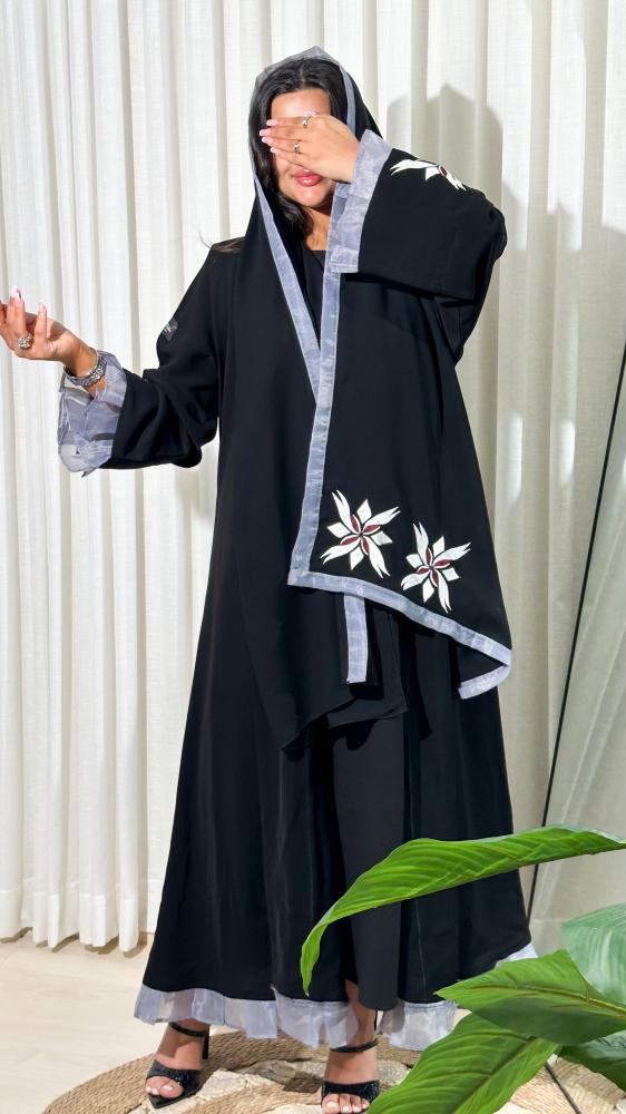 "العباية تأتي مع طرحة متناسقة كأحد ملحقاتها الأساسية، لتمنحكِ إطلالة متكاملة وراقية"